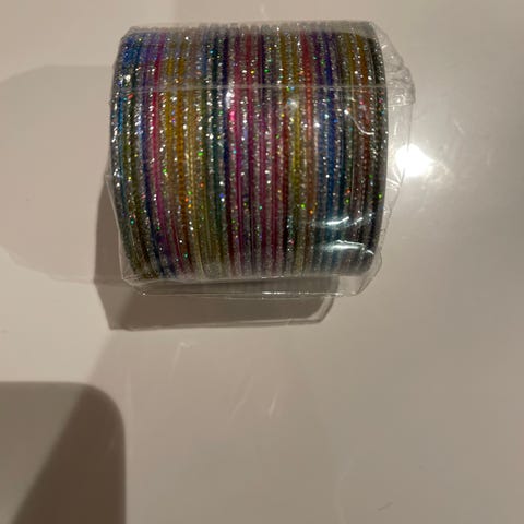 Selger et sett vakre håndlagde glassarmbånd med detaljert gullbroderi og blå dekor. Armbåndene glitrer nydelig i lyset og gir et luksuriøst preg til både festantrekk og hverdagsbruk.