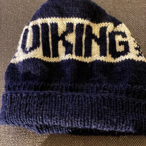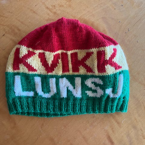 Selger en lue fra House of hygge med teksten «Frøken fjong».