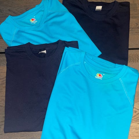 Fruit of the Loom langermet T-skjorte i størrelse M. T-skjorten har flerfarget design med hvit kropp og ermer i forskjellige farger (blå, rød, svart). Materialet er ikke spesifisert, men typisk for Fruit of the Loom er bomull eller bomullsblanding. Passer for menn.