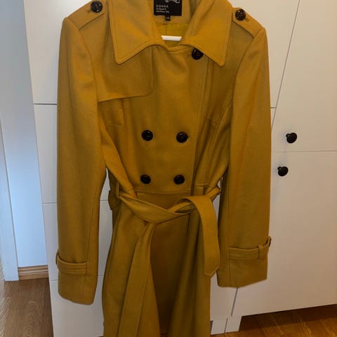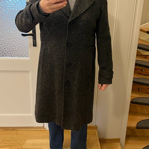Donna ullkåpe i mørk lilla farge, dame størrelse 42. Plagget har et enkelt design med en knappelukking foran og er foret på innsiden. Egnet som yttertøy for kjøligere vær.