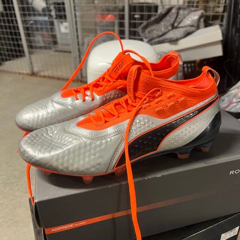 Selger eldre toppmodell fra Puma: Puma One Silver/Shocking Orange i størrelse 42,5. Jeg har kun brukt skoene en gang, da de rett og slett var for trange for mine føtter.