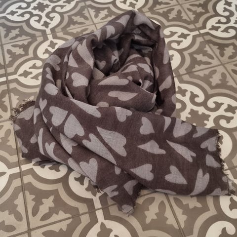 Brunt og pale, lysegrått skjerf med frynser. Lett gjennomsiktig. Mangler stofflapp men føles som lin og/eller bomull (kan ta feil).