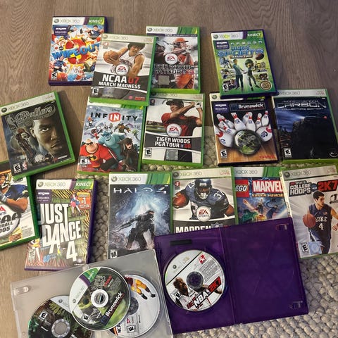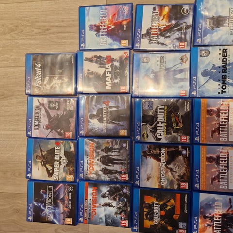 Sony PlayStation 3 spillkonsoll med to kontrollere, en svart og en blå. Inkluderer en samling av 14 spilltitler, blant annet The Last of Us, Heavy Rain, Quantum of Solace, FIFA 11, Max Payne 3 og Gran Turismo 5. Spillkonsollen er svart og designet for hjemmeunderholdning.. Mangler kabel til å lade kontrollere (joystick).