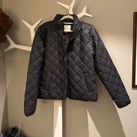 KAFFE Vinterjakke for kvinner i størrelse 40. Jakken er beige og har en polstret, varm design med hette. Egnet for kaldt vær.