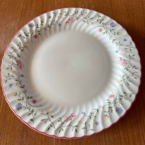 Design: Benhvitt porselen med rosa kant og blomstermønster av klematis (Clematis Jackmannii).