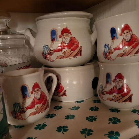 Seks glasskrukker med hank og korkbrikke selges. Nesten ubrukt, veldig pene.