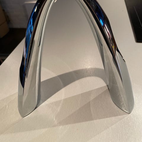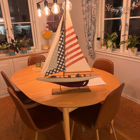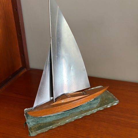 Denne seilbåten fikk vi i present og den ble aldri satt fram. Den er i stål og gjuten i 2 deler. Den hålles ihop med en skrue under.