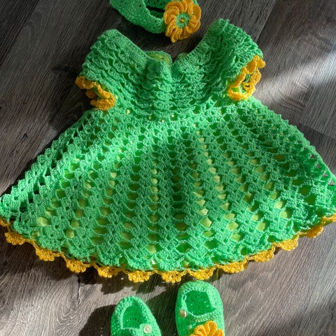 Helt ny, håndheklet babydress i størrelse ca 62.