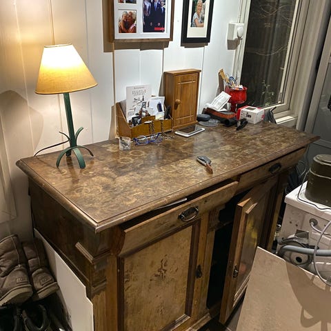 Ukjent merke, men mest sannsynlig fra Skeidar. Kjøpt på 90-tallet. Møbelet har gått fra naturlig lys til mørk brun trefinish ved bruk av brun oljebeis fra Bolia. Noen deler er fortsatt lyse. Må påregne noe restaureringer, men har tålt vekten av mange tunge bøker, så er fortsatt helt brukbar. Må hentes.