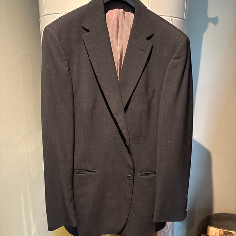 Redaelli dress i brun farge, herrestørrelse 48. Jakken har en klassisk design med knappelukking og lomme på innsiden. Dressen er 100% merino ull.