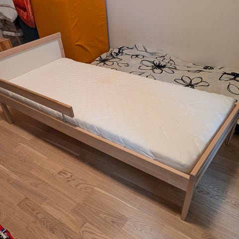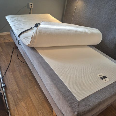 Litt over ett år gammel seng, elektrisk justerbar rygg og fotdel, fjernkontroll medfølger. Kjøpt ny på Jysk, tilsvarende seng ny pris 12.000,-