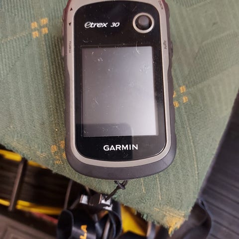 Garmin eTrex GPS-enhet i gul og svart farge. En bærbar navigasjonsenhet designet for utendørs bruk. Utstyrt med skjerm og festemuligheter på baksiden for enkel håndtering og montering.