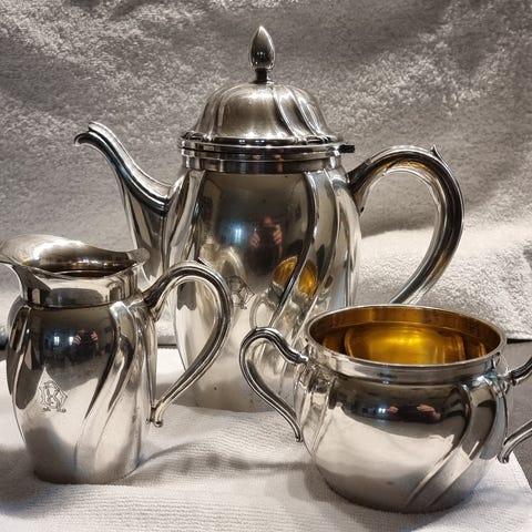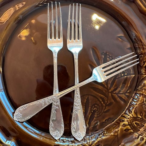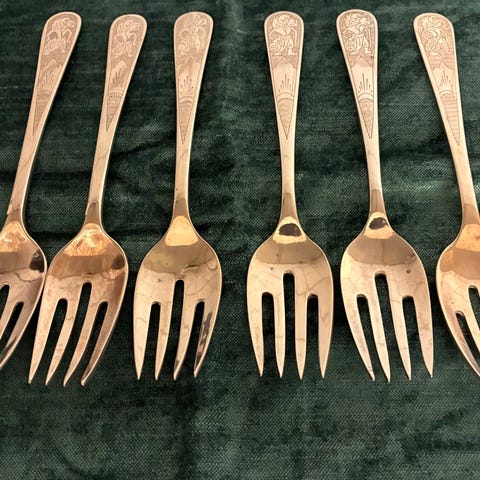 Eik spiseskjeer i sølvplett 40. Kjøpt i sin tid hos J. Børsum Gullsmed & gravør.
