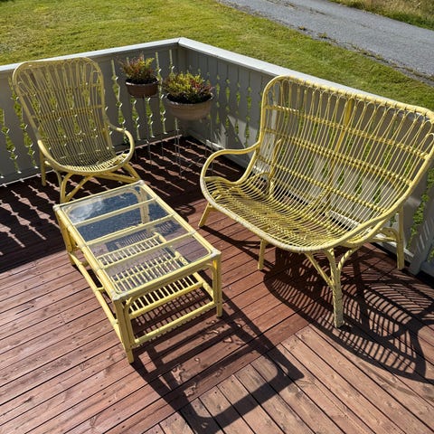 Utemøbelsett i grå kunstrotting med putekasse, puter, stoler og sofa