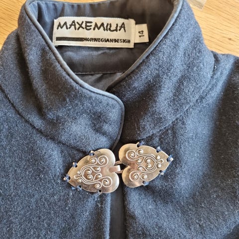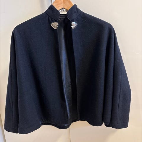 Pent (knapt) brukt cape i mørk marineblå ullblanding ( 65% ull og 35% viskose) og fôret med marineblå kunstsilke i 100% polyester. Lukkes i halsen med to tinnfargede capespenner.