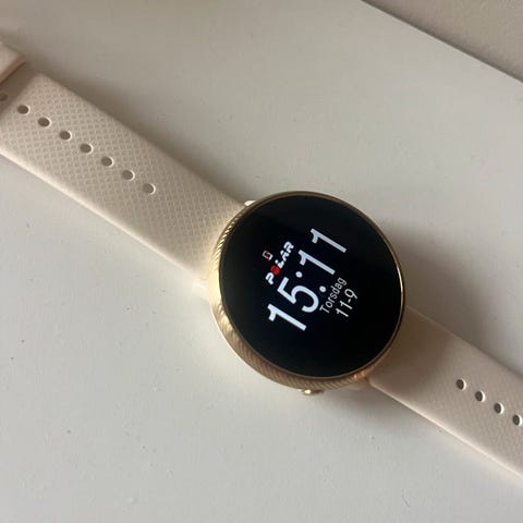Polar Ignite smartklokke med hvitt silikonarmbånd. Klokken har en rund skjerm med berøringsfunksjon, og viser tid, dato og treningsdata. Passer for både menn og kvinner og egner seg for trening og daglig bruk.