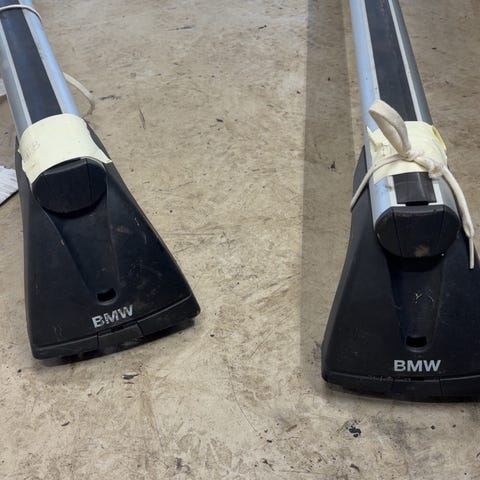 BMW takstativ med tilbehør for montering på bil. Inkluderer to tverrbjelker og to nøkler for låsing av stativet. Materiale er hovedsakelig metall og plast. Designet for sikker transport av last på taket av bilen. Selger også originale gulvmatter - mattesett separat for NOK 1200.