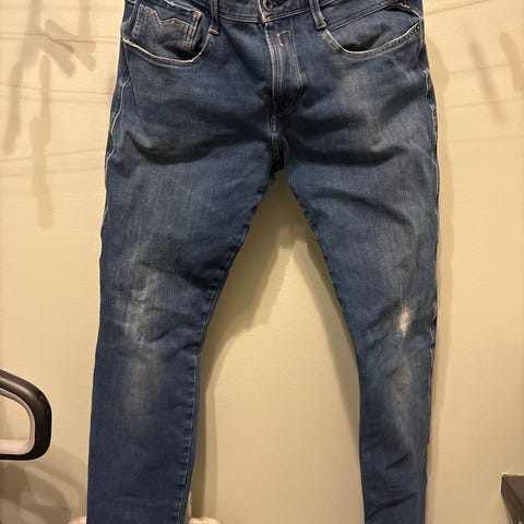 Replay Eco Natural jeans for menn i størrelse W34 og M. Fargen er grå. Laget av materialer som følger Replay Eco Natural-seriens standarder.