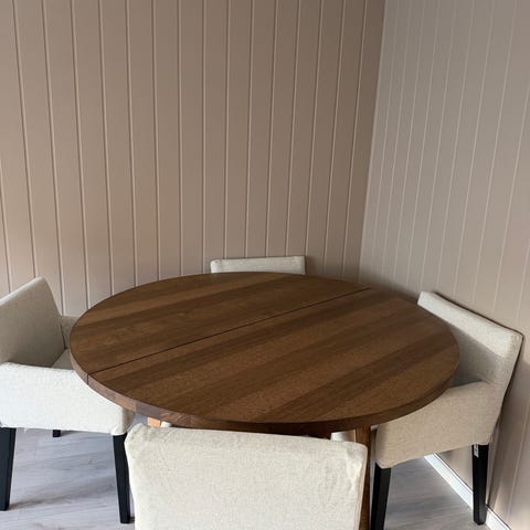 Vanlig bruksmerker på bordet og stolene, mulig noen flekker som ikke er forsøkt fjernet, to av stolene stolen har en liten rift i kanten