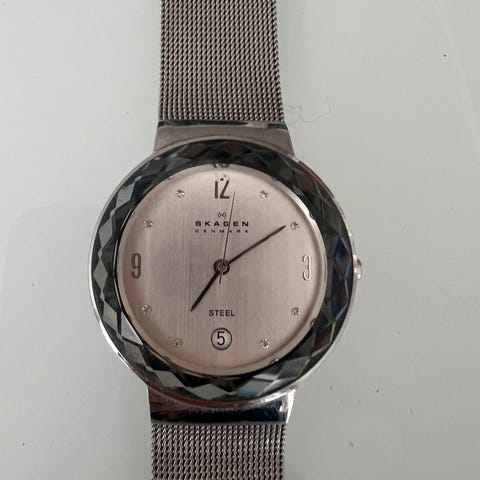 Svært dekorativ Skagen klokke, sølvfarget. Klokken er enkel og stilren med blanke små stener rundt urskiven. Ingen synlige bruksmerker. Må ha nytt batteri. Kan sendes. Kjøper betaler frakt.
