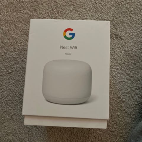 Google Nest Wifi mesh Router og aksesspunkt i hvit farge. En trådløs ruter designet for å gi pålitelig nettverkstilkobling i hjemmet. Enheten har et minimalistisk og kompakt design som passer i ulike miljøer.