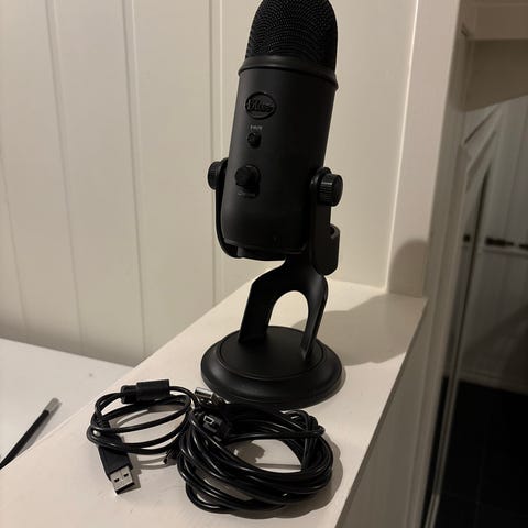 Blue Yeti USB-mikrofon med svart finish. Mikrofonen har et robust design med justerbar støtte og flere opptaksmoduser for variert bruk.