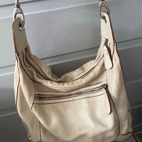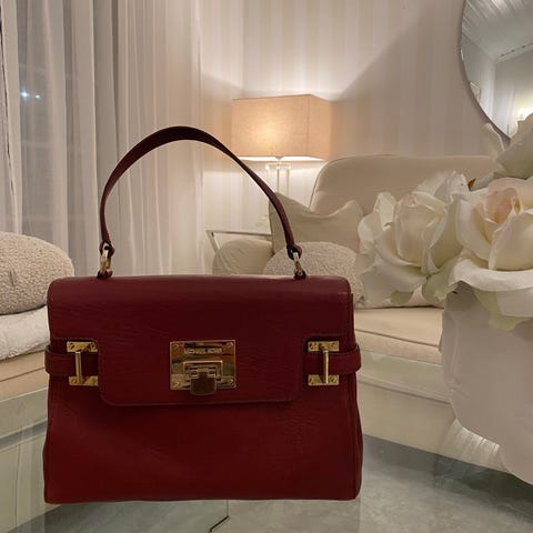 Selger en vakker og tidløs veske i ekte italiensk skinn av høy kvalitet. Vesken har strukturert fasong, gullfargede detaljer og et klassisk uttrykk som passer både til hverdag og fest.