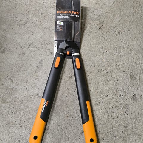 Fiskars QuikFit teleskopskaft med en lengde på 4 meter. Verktøyet har et godt sagblad, og er egnet for beskjæring av høye hekker og grener.
