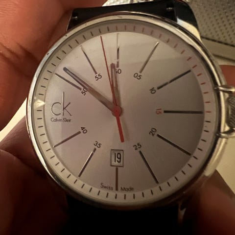 Calvin Klein herreklokke med sølvfarget urskive og svart rem. Remmen mangler hempe. Pent brukt, noen små bruksmerker. Nypris ca 2000 kroner.