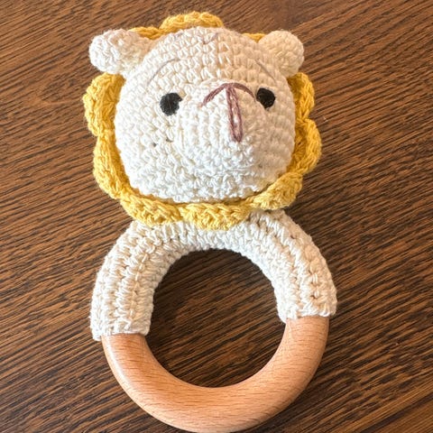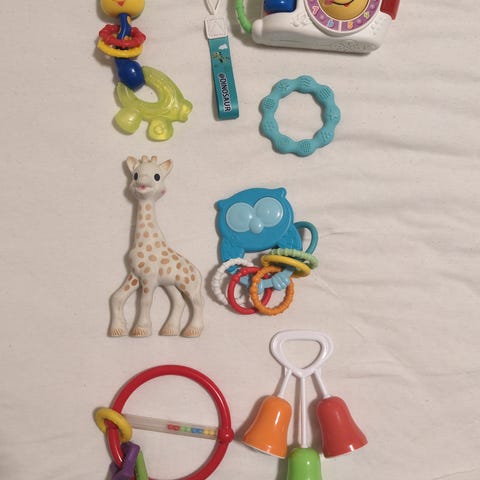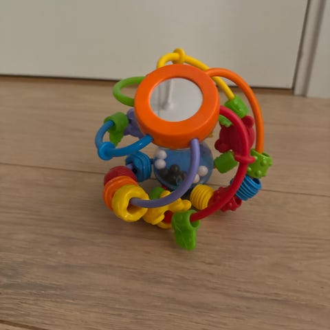 Fisher-Price Barnleke Rangle med rosa håndtak. Laget av plast, designet for små barn. Har et fargerikt motiv med dyr og et trekantet håndtak for enkel grep.