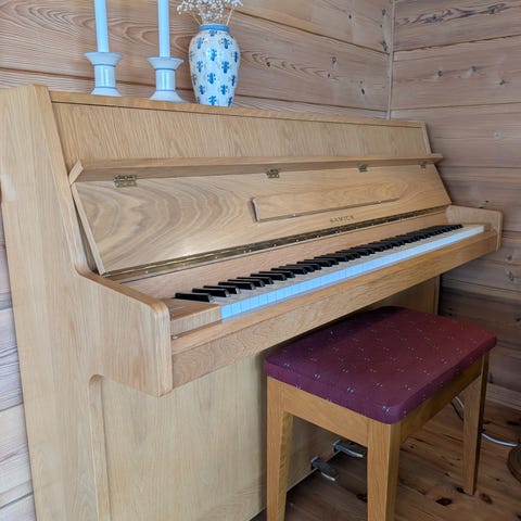 Lite retro piano for barn. Har en ripe og en knott som har falt av, vises på siste bilde. Det er også en av tangentene helt mot høyre som ikke gir fra seg lyd.