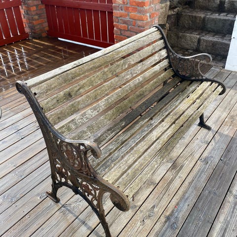 Smijernsbenk med sete og rygg laget av treplanker og støpte metallarmer. Benken har en klassisk design med dekorative metallarmer og ben. Passer til utendørs bruk i hager, parker eller andre områder. Har stått innendørs og den er meget lite brukt. Ikke rust. Må hentes.