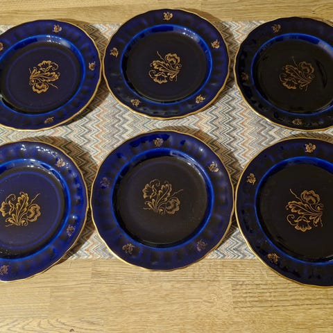 6 stk er pene og hvitere, og 6 stk gulere i fargen.. Noen har mer gulldekor på blå blomster..De er samlet på over flere år, og har ulik alder og bruk.. Men de er fantastisk fine😍