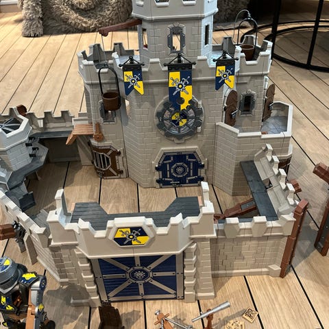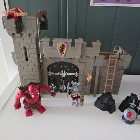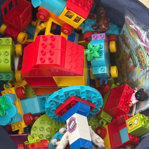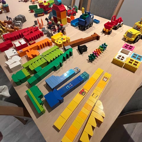 LEGO DUPLO Slott og figurer sett med ulike byggeklosser, figurer og tilbehør. Settet inneholder flere fargerike deler, inkludert dyr og mennesker, egnet for barn.