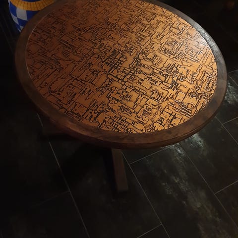 Retro, pent brukt. Produsert i Norge ca 50-60tallet. Buede bordbein og buer i bordplaten. Et par "striper i lakken."