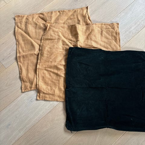 Et mørkegrønt og et gult putetrekk selges.