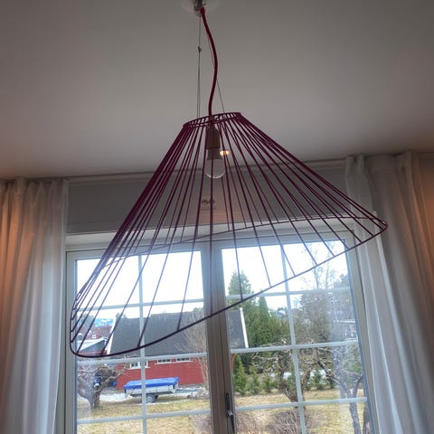 Nydelig taklampe selges. Lengde ca 38cm, diameter på det største ca 28 cm. Taklampen henger helt rett, det ene bildet viser at den henger skjevt da vi ikke hadde ordnet trådene riktig før bildet. Må hentes i Ottestad