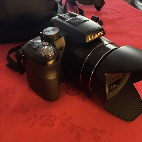 Panasonic C-2200ZM kompaktkamera i svart farge. Kameraet har innebygd blits, zoomfunksjon med vidvinkel og teleobjektiv, samt et LCD-display for innstillinger. Kameraet bruker 35 mm film og har manuell på/av-bryter og modusknapp for enkel betjening.