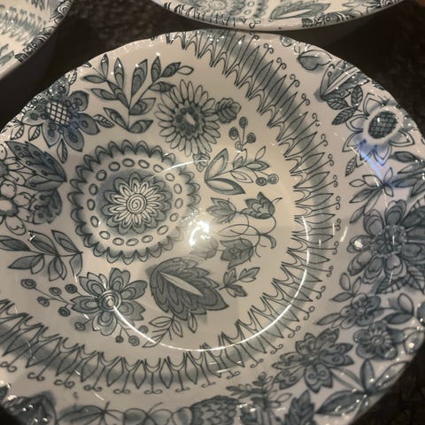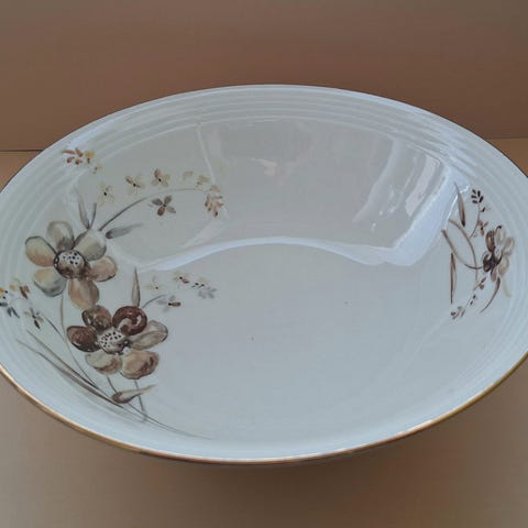Diameter 16,2 cm. Noen svake bruksmerker etter bestikk og litt slitasje på gullkanten rundt. Ingen skader eller krakkelering. Selges samlet for 100 kr.