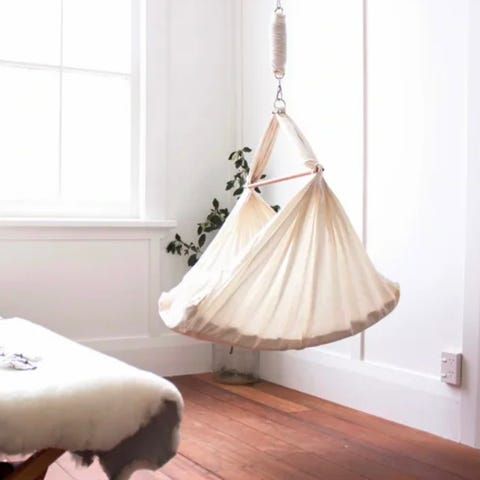 Vugga er meget pent brukt og av merket Natures Sway. Det følger med dørkarmoppheng og Membantu-motor. Dørkarmoppheng er perfekt for de som ikke har så god plass, eller som ønsker å slippe stativet og plassen det tar. Det er også helt nydelig å kunne flytte vugga rundt omkring i leiligheten/huset, ta den med på hytta/på besøk osv.
