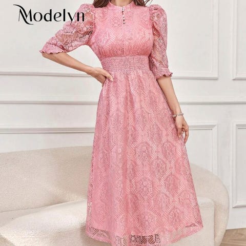 Selger en nydelig festkjole fra Shein i størrelse 38/M, rosa farge med svart blomsterprint. Laget i et lett og gjennomsiktig materiale med dekorative ermer. Passer til formelle anledninger eller festbruk.