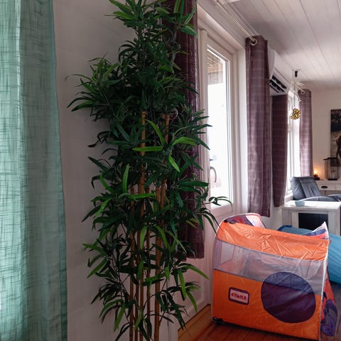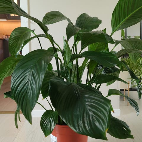 En lettstelt frodig plante med store, grønne blader og gule kolber omsluttet av hvite hylsterblader. Trives best i halvskygge. Blomstrer mest hvis den får stå på et lyst sted. Regelmessig vanning og hold jorden jevnt fuktig. Om bladene henger er det tegn på den er tørst. Potte str Ø20 cm. Hentes på Bryne