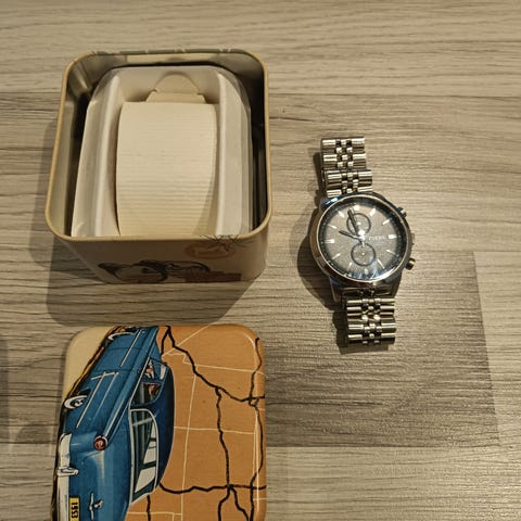 Helt ny Fossil Star Wars Limited Edition R2-D2 automatisk klokke med stål lenke. Klokken leveres med original eske og sertifikat for ekthet. Kun 1983 stk ble laget. Når man åpner boksen så lager det lyden til R2-D2, men dessverre så døde batteriet, kan muligens byttes ny.