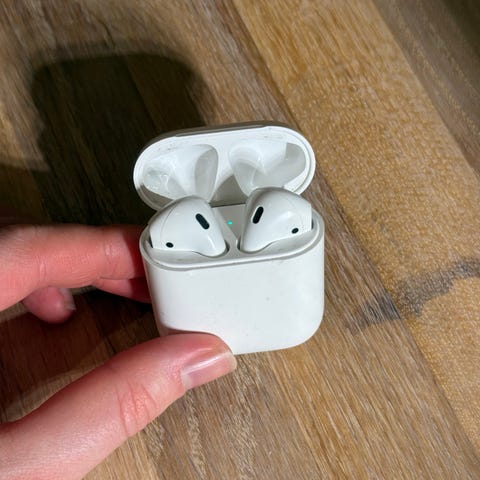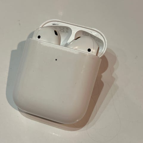 Selger Apple AirPods gen 2. AirPods gen 2 tilbyr opp til 5 timers lyttetid på en enkelt opplading, og har mer enn 24 timers samlet spilletid med oppladingsetui, støydemping og utrolig god lyd