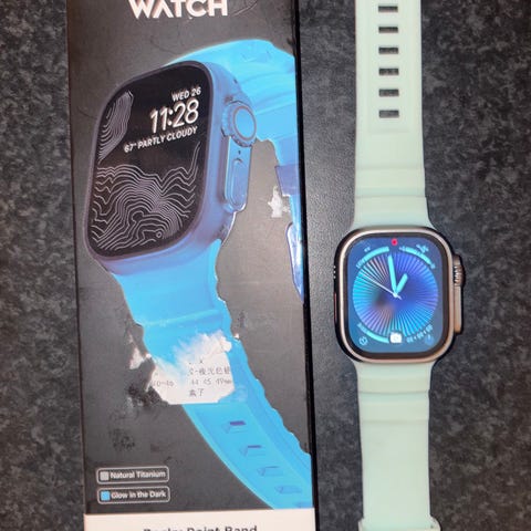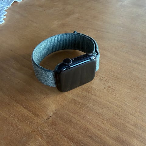 Apple Watch remskesett med fem forskjellige remmer i ulike materialer og farger. Settet inkluderer remmer i grønn silikon med hull, beige tekstil, brun lær, hvit silikon med hull og beige flettet materiale. Passer for Apple Watch, størrelse og kjønn avhenger av kompatibilitet med klokkens modell.