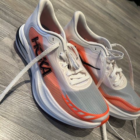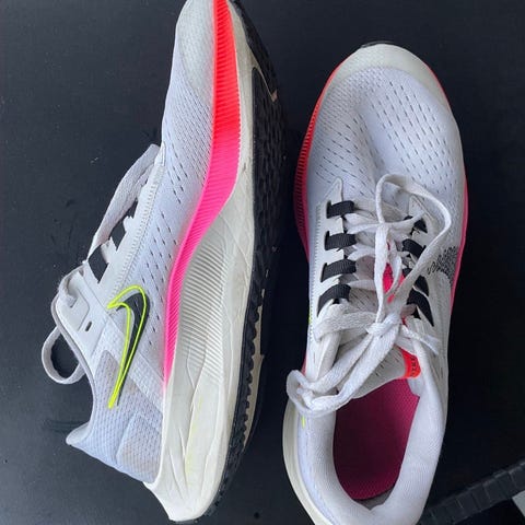 Nike ZoomX løpesko for dame i størrelse 39. Skoene har en kombinasjon av hvit og rosa farge, med en såle som inkluderer ZoomX-teknologi. Designet for løping med fokus på komfort og ytelse.