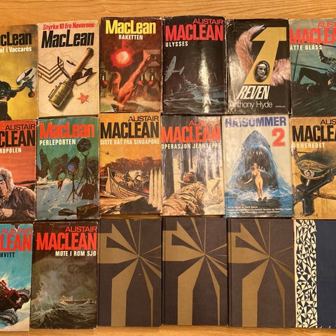 Alistair MacLean bokserie bestående av 21 krimbøker. Bøkene har innbundet format med varierende farger på omslaget, inkludert blå og beige toner. Serien viser noe bruksslitasje og aldersrelaterte merker, spesielt på ryggene. Passer for samlere eller lesere interessert i Alistair MacLeans litteratur.