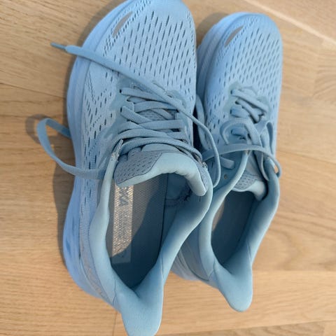 Hoka Clifton løpesko i størrelse 36,2/3 farge turkis. Skoene er designet for løping og har en lett og pustende konstruksjon. Materialet består av mesh for god ventilasjon, og skoene har demping som gir støtte under løpeøkter.