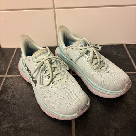 Hoka Clifton løpesko i størrelse 36,2/3 farge turkis. Skoene er designet for løping og har en lett og pustende konstruksjon. Materialet består av mesh for god ventilasjon, og skoene har demping som gir støtte under løpeøkter.