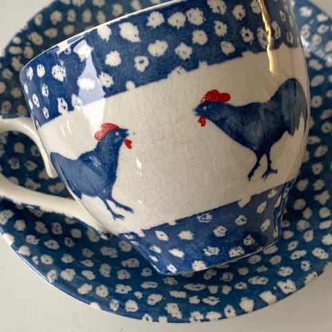 12 stk 500,- for alle. Kopper med håndtak og underskål dekorert med motiv av en hane.